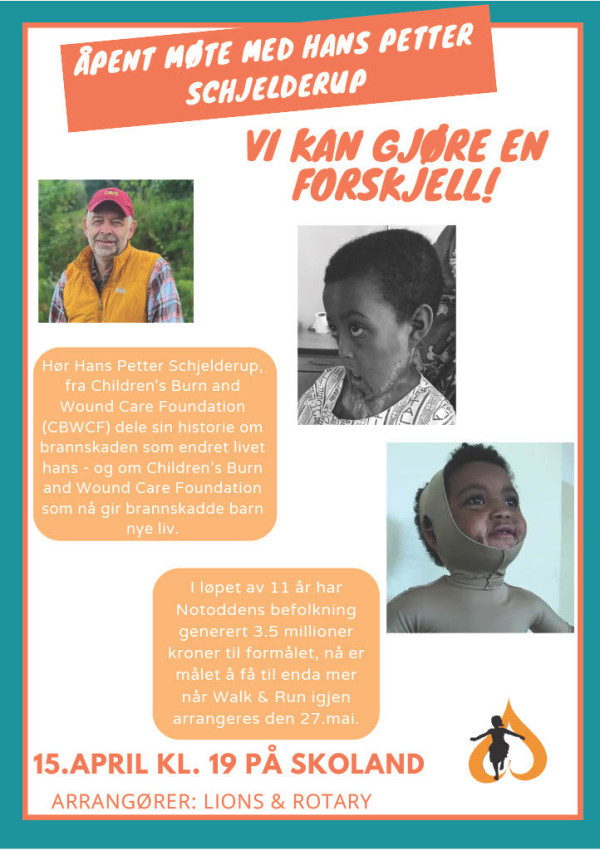 Hvis du har anledning så benytt denne muligheten til å få høre Hans Petter Schjelderup fortelle om Children Burn & Wound Care Foundation og det enestående arbeidet de utfører. Møtet finner sted på Skoland Aktivitetssenter, samme sted som Rotary Notodden har sine møter.