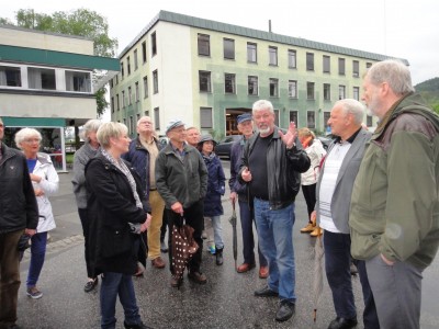 Flotte bygninger! Høybygget bakerst til høyre er tidligere bl.a. blitt foreslått som mulig Bok & Blueshus for Notodden. Der har det forøvrig tidligere bl.a. blitt produsert forbrenningsanlegg til mange av verdens største og flotteste cruiseskip. Foto: Inge O. WaageKasin er glad, og synlig stolt, over å representere en eier som tenker bevaring og rehabilitering, heller enn kun fokus på kortsiktig profitt. Han ga oss en fin innføring i hva eierne har utrettet i så måte, og hva planer man har videre. En del virksomhet er etablert, men fremdeles står mer enn halvdelen av bygningene tomme. Ønsket er å få bedrifter av typen Biltema interesserte. Slik type virksomhet kan lettere la seg kombinere med industri enn om noen av de gamle industribyggene skulle omdannes til boliger. Han la heller ikke skjul på sitt syn på at Ovnshus A ville være det perfekte stedet for etablering av Verdensarvsenteret. og det uten flytting av "Lysbuen" fra Øvre Tinfos! Han fortalte også at kunstneren Axel Mørch som er medlem i klubben vår, har flere av sine kunstverk i Hydroparken.