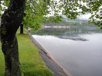 Hydroparkens beliggenhet må kunne sies å være meget fin, der den strekker seg helt til Heddalsvannet. De gamle granittblokkene fra prosesstårnene er blitt gjenbrukt som "kantstein" i skråningen mot vannet. De er godt synlige når man går en tur langs vannfronten i Hydroparken. En overskyet himmel og lite lys, klarte likevel ikke å ødelegge idyllen i skumringstimen denne mandagskvelden. Foto: Inge O. Waage