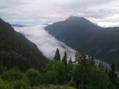 Rjukan, Vestfjorddalen og Gaustamassivet (med toppen i skyene) i bakgrunnen, før og etter at tåka kom sigende. Fotos: Inge O. Waage.