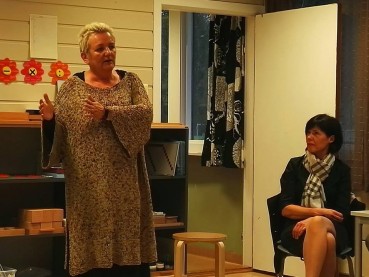 Over til venstre: Torhild Landsverk, lærer/pedagogisk leder gir oss her informasjon om skolens opplegg. Over til høyre: Inger-Lise Olsen (t. v. i bildet) rektor ved skolen, gir supplerende informasjon. Vårt klubbmedlem