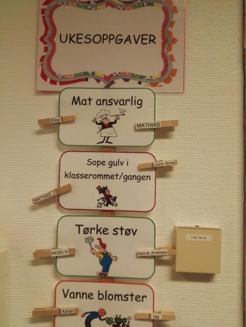 Til venstre: Barna får spesielle ukesoppdrag. Disse går på omgang gjennom skoleåret. Foto: Svein Aanestad.