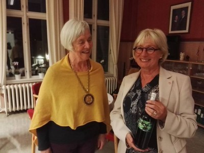 Til v.: Vår klubbpresident Anne-Grethe Aanestad hadde gleden av å kunne overrekke Lise Wiik en flaske Solbærsaft fra Landsverk gård i Sauland. Foto: Svein Aanestad.