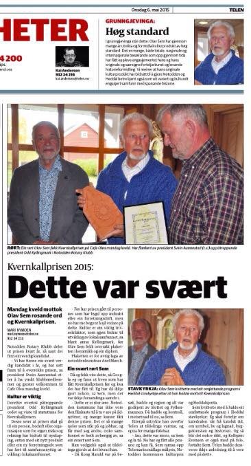 Avisen Telen var også tilstede under overrekkelsen av prisen i Kafè Olèa og hadde en omtale av begivenheten 6. mai, 2015: