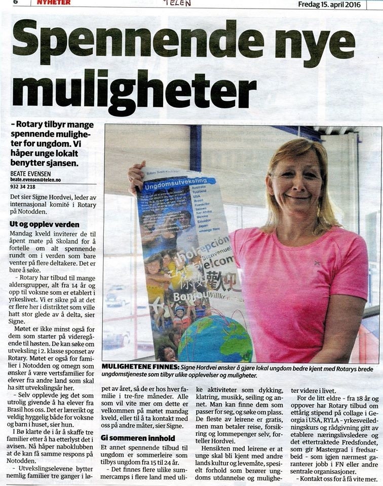 Flott profilering av Rotarys tilbud til unge i avisen Telen i dag 15. april, 2016. Signe Hordvei, som bl.a. har ansvaret for Rotary Notoddens aktiviteter rettet mot unge, blir i avisen Telen intervjuet om Rotarys omfattende tilbud til ungdom i hele verden. Dette er en omfattende del av Rotarys internasjonale arbeid. Rotary Notodden retter en takk til Telen for hjelpen med å få presentert dette viktige arbeidet, som flere lokale ungdommer gjennom årene har fått dra nytte av. En takk også til Signe med flere som står på for å få presentert disse tilbudene til de unge i klubbens nedslagsfelt. Førstkommende mandag 18. april kl 20:00 blir det altså anledning til å få høre mer om dette arbeidet på Rotary Notoddens møte i 1. etasje på Skoland Aktivitetssenter, Notodden. Interesserte kan også kontakte klubben via knappen KONTAKT OSS ovenfor for å få mer informasjon. De kan også åpne linkene nede til venstre på denne hjemmesiden for å skaffe seg mer informasjon om Rotarys omfattende virksomhet både nasjonalt og internasjoinalt.