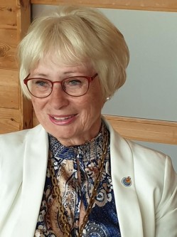 Bilde til venstre: Lise Wiik, rutinert leder fra mange sammenhenger, har styrt klubben trygt gjennom Rotaryåret 2018-19. Hun takket for godt samarbeid i sitt presidentår og hun fikk velfortjent takk og mange godord i retur fra medlemmene. Foto: Svein Aanestad.
